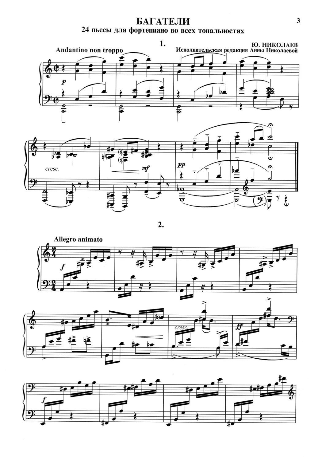 ISMN 979-0-706437-26-2 Николаев Ю.В. Багатели. 24 пьесы для фортепиано во всех тональ ностях. — М.: Издательство «КОМПОЗИТОР», 2018. - 28 с. Исполнительская редакция Анны Николаевой